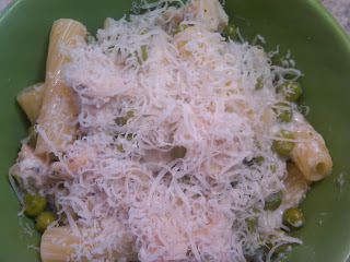 Remove sautéed chicken pieces from pan.  Heat olive oil and add in garlic and cook until softened.  Add in chicken broth and whisk in flour.  Allow to thicken and gradually add in milk.  Add in spices and chicken.  Stir in Parmesan cheese and peas.  Serve over your favorite pasta and top with some more Parmesan.